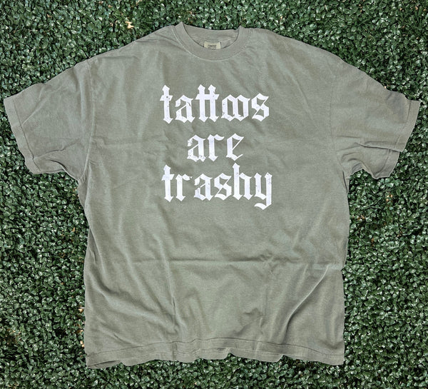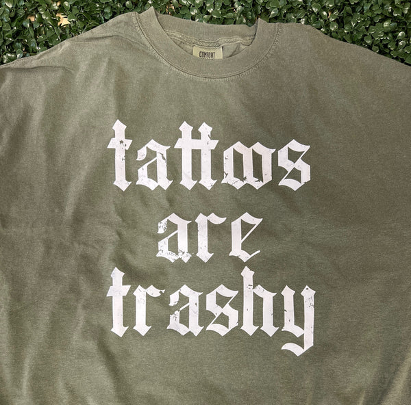 Design: “Tattoos Are Trashy” in distressed gothic lettering