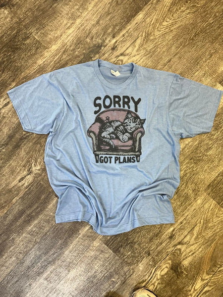 For the introverts, the cat lovers, and the homebodies â our âSorry I Got Plansâ tee says it all. Featuring a cozy kitty lounging in an armchair, this shirt is the perfect way to let everyone know your plans involve staying in and doing absolutely nothing (and youâre not sorry about it).