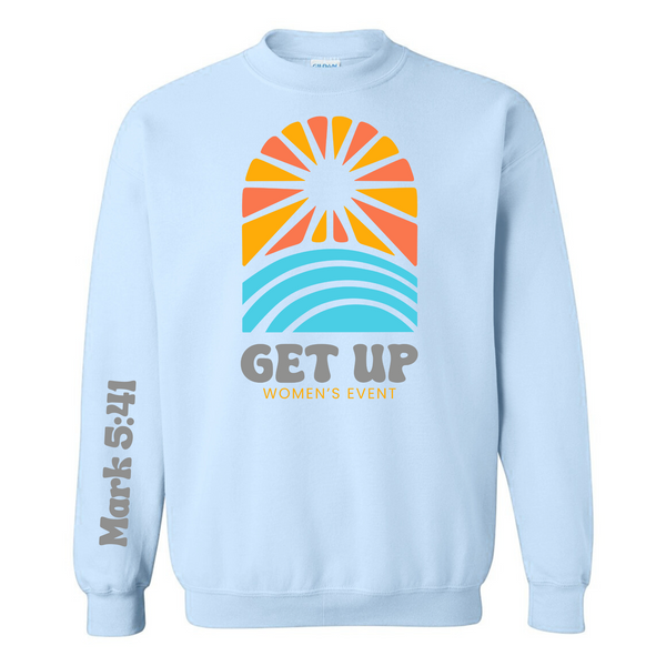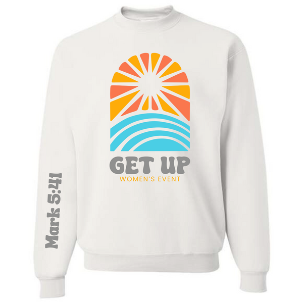 Brighten your wardrobe and celebrate faith with this inspiring sweatshirt designed for the Get Up Women’s Event! Featuring a bold sunrise graphic with vibrant orange, yellow, and aqua tones, the design is paired with the uplifting scripture reference Mark 5:41 on the sleeve for an extra meaningful touch.