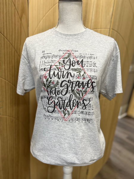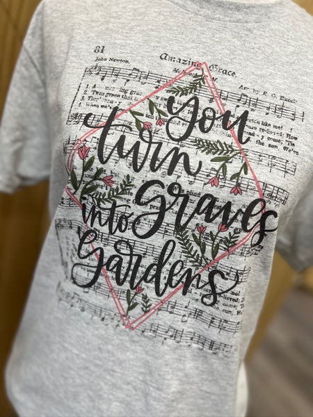 Celebrate the powerful message of transformation and hope with our “You Turn Graves Into Gardens” tee — inspired by the beloved worship song. The design features elegant lettering layered over Amazing Grace sheet music with florals and a subtle geometric frame, beautifully symbolizing redemption and new life found in Jesus.