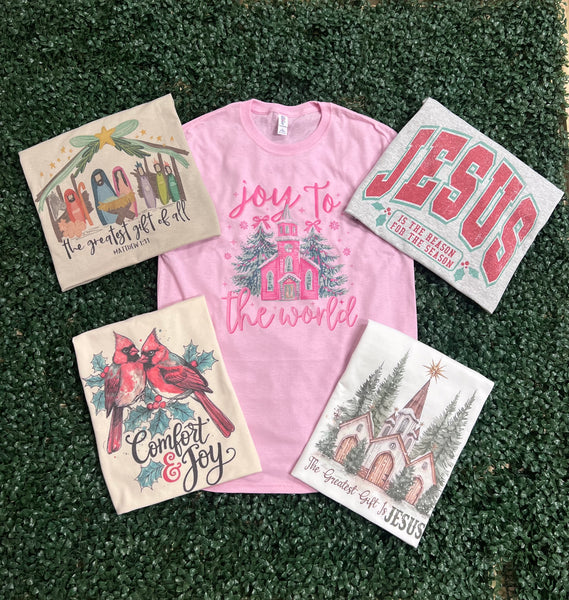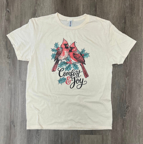 Bring warmth and peace to your holiday season with our “Comfort & Joy” tee — a beautiful reminder of love, hope, and togetherness. Featuring two bright red cardinals perched among holly leaves and berries, this design captures the heart of the season with a timeless, cozy feel.