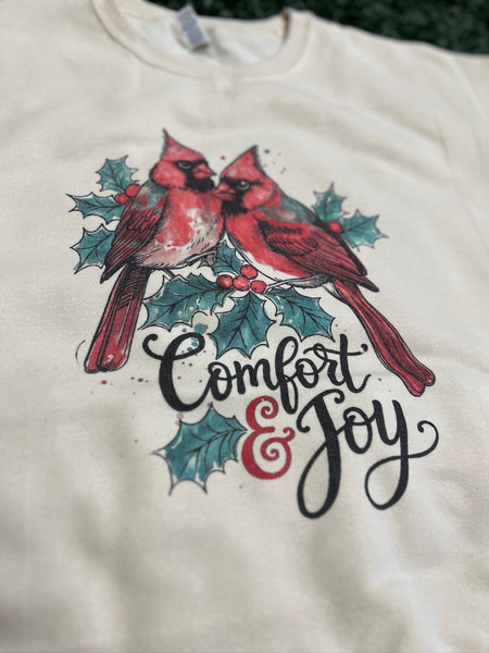 Bring warmth and peace to your holiday season with our “Comfort & Joy” sweatshirt — a beautiful reminder of love, hope, and togetherness. Featuring two bright red cardinals perched among holly leaves and berries, this design captures the heart of the season with a timeless, cozy feel.