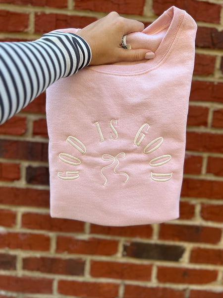 “God Is Good” Embroidered Sweatshirt – Jerzees Light Pink or Cream
