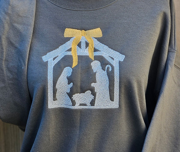 Celebrate the true meaning of Christmas with this beautifully embroidered Nativity Scene sweatshirt. Featuring a detailed silhouette of Mary, Joseph, and baby Jesus under the manger, topped with a shimmering gold bow, this sweatshirt is a timeless reminder of the reason for the season.