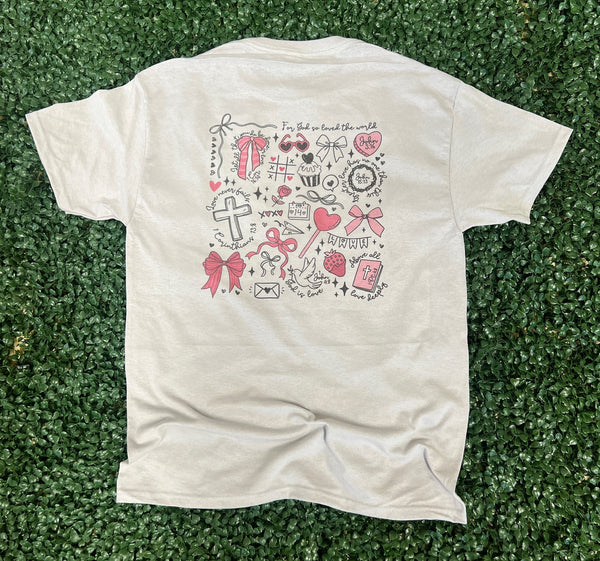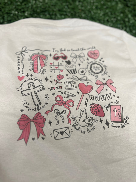 Design: Valentine-inspired Christian doodles, scripture references, hearts, bows & symbols