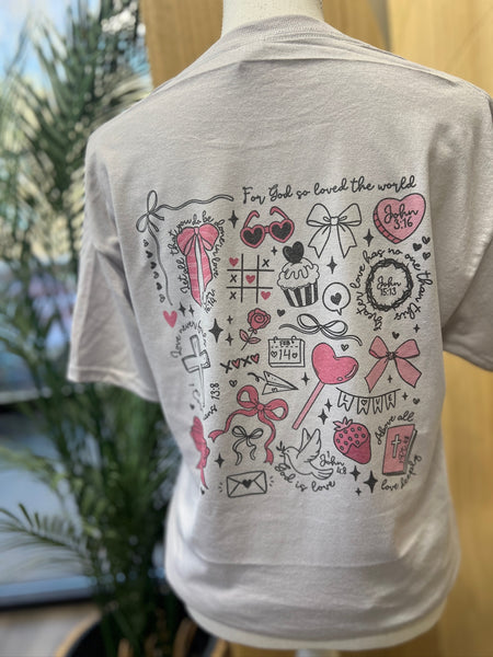 Celebrate love and faith in style with our Silver Sublimated Valentine’s Tee, featuring a small front pocket print and a large, beautifully detailed back design. This tee is the perfect blend of sweet Valentine aesthetics and uplifting Christian inspiration.