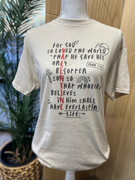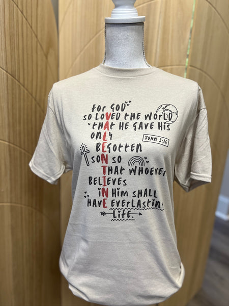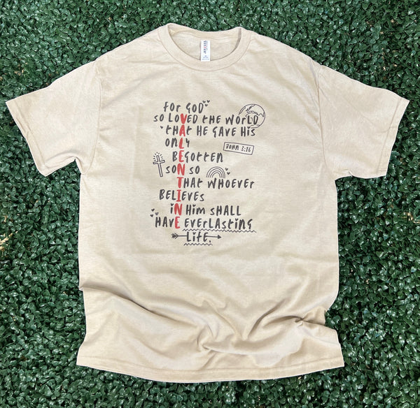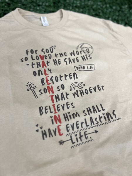 John 3:16 Valentine Tee – Sublimated on Sand | Christian Valentine Shirt