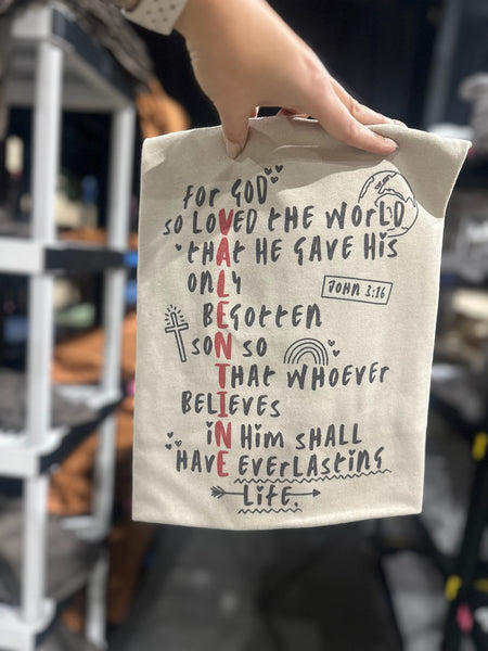 Share the true meaning of love this Valentine’s Day with our John 3:16 Valentine Tee. Sublimated on a soft sand-colored tee, this design creatively highlights the word VALENTINE within the beloved Bible verse, making it a heartfelt reminder of God’s everlasting love.