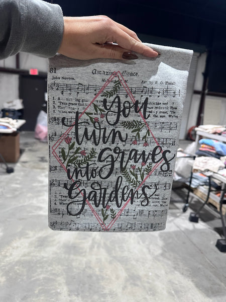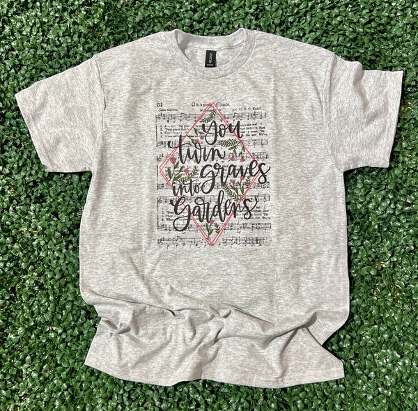 Celebrate the powerful message of transformation and hope with our “You Turn Graves Into Gardens” tee — inspired by the beloved worship song. The design features elegant lettering layered over Amazing Grace sheet music with florals and a subtle geometric frame, beautifully symbolizing redemption and new life found in Jesus.