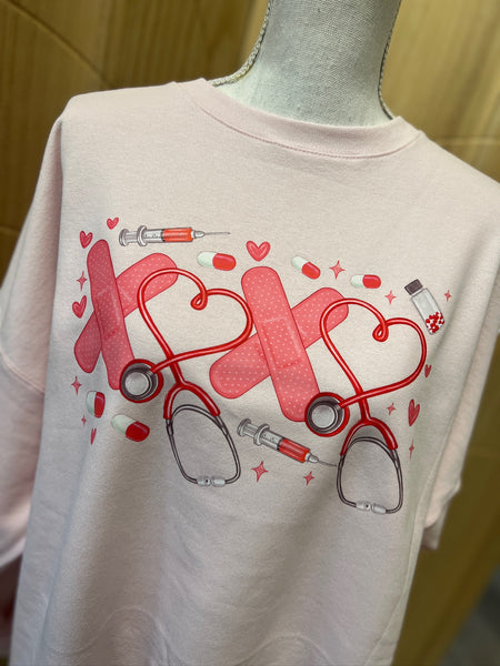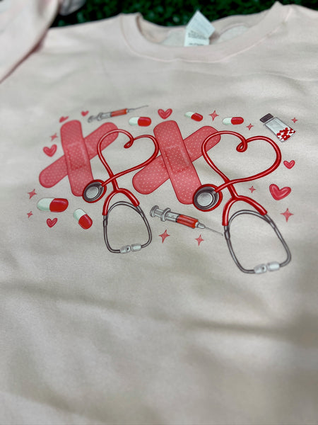 Show your love for nursing and Valentine’s Day with this adorable Healthcare Valentine Sweatshirt! Designed with playful hearts, bandages, syringes, and stethoscopes, this cozy crewneck is the perfect mix of sweet and scrubs-life sass. Whether you're caring for patients or celebrating the season of love, this soft pale pink sweatshirt is made to brighten your shift and your wardrobe.