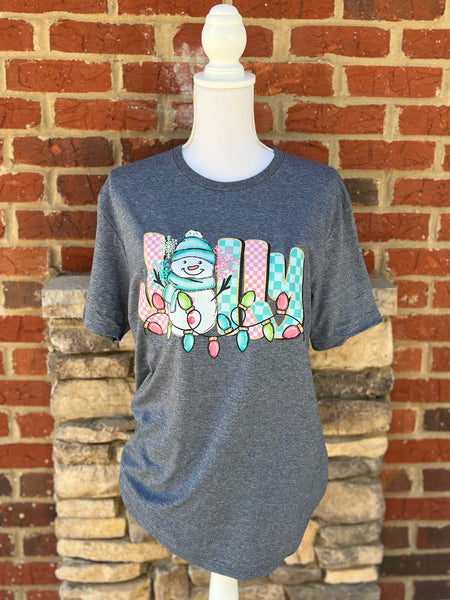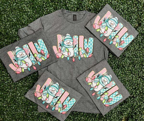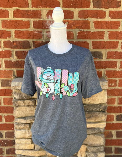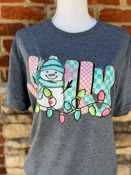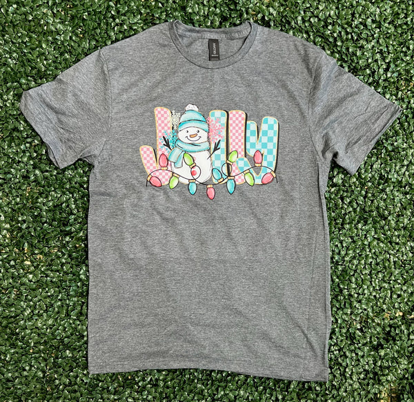 Bring the merry vibes wherever you go with our Jolly Snowman Tee! Featuring a cheerful snowman wrapped in colorful Christmas lights and festive patterned letters that spell “JOLLY,” this tee is the perfect way to spread holiday joy all season long.