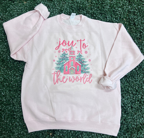 Spread a little holiday cheer in the sweetest way possible with our “Joy to the World” sweatshirt! This soft pink sweatshirt features a charming church scene surrounded by snowy trees, stars, and delicate bows — capturing the cozy magic of Christmas with a feminine touch.