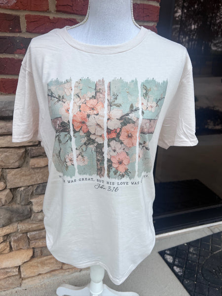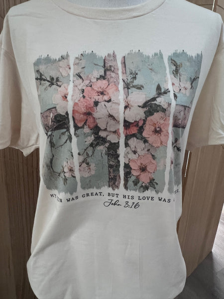 A beautiful reminder of grace and redemption, the My Sin Was Great, But His Love Was Greater tee features a soft floral cross design paired with John 3:16. This meaningful artwork blends faith and elegance, making it a timeless piece you’ll reach for again and again.