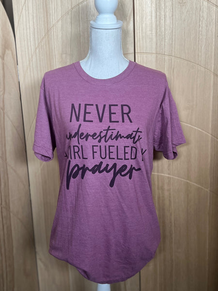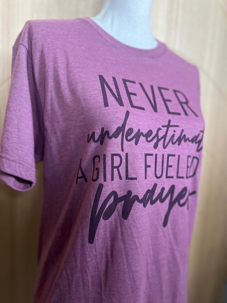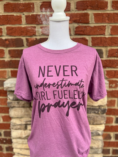 “Never Underestimate a Girl Fueled by Prayer” Tee – Tultex Heather Cassis