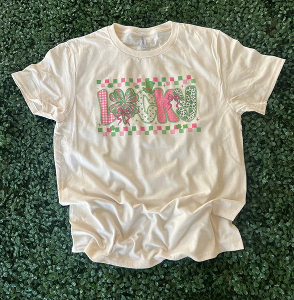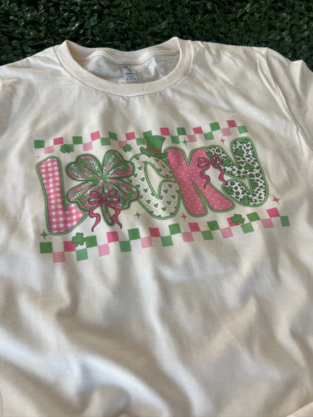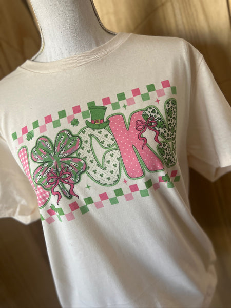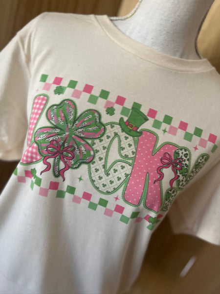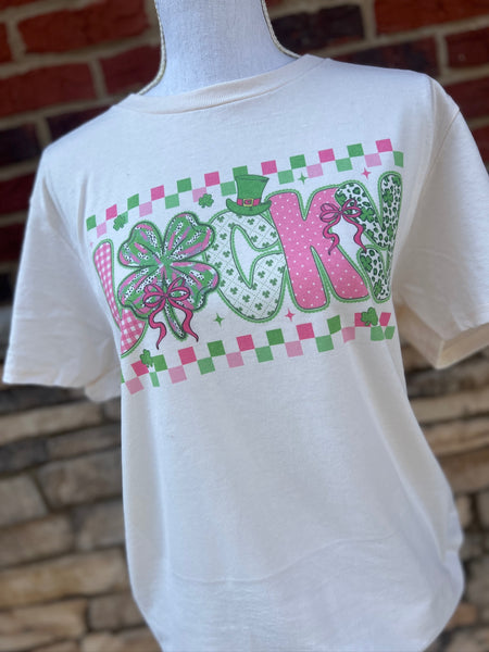 Add a little charm to your wardrobe with our Lucky Shamrock Tee — the perfect mix of festive and feminine. Featuring playful patchwork-style lettering with gingham, clovers, bows, and sweet St. Patrick’s details, this design brings a fun pop of pink and green to your seasonal style.