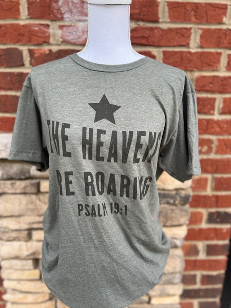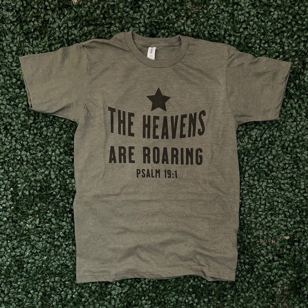 “The Heavens Are Roaring” Psalm 19:1 Tee – Tultex Heather Military Green