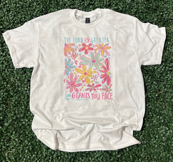 Spread faith and encouragement everywhere you go with this bright and joyful Christian tee! Featuring a colorful floral design paired with the uplifting message: “The Lord is greater than the giants you face,” this shirt is a daily reminder of strength and hope rooted in faith.