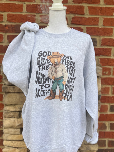 “God grant me the vibes... the serenity to accept...” styled with a whimsical cowboy bear illustration, creating a relaxed and uplifting look that stands out effortlessly.