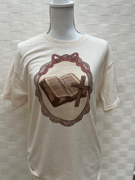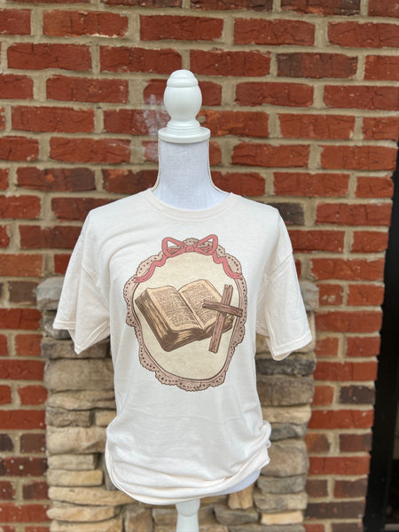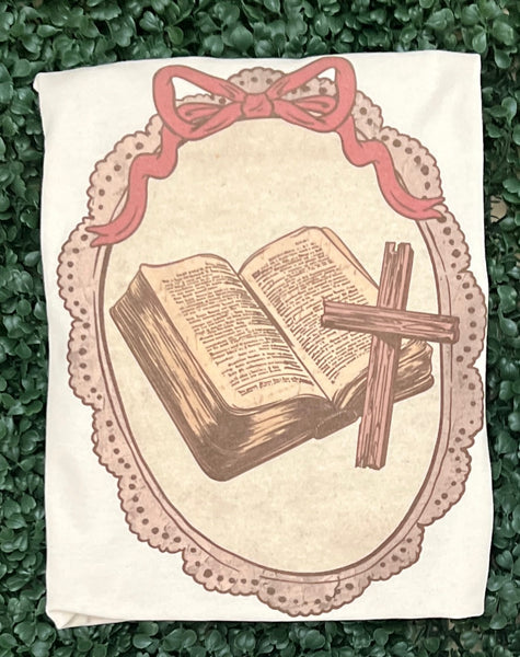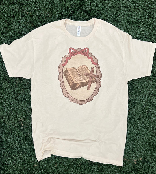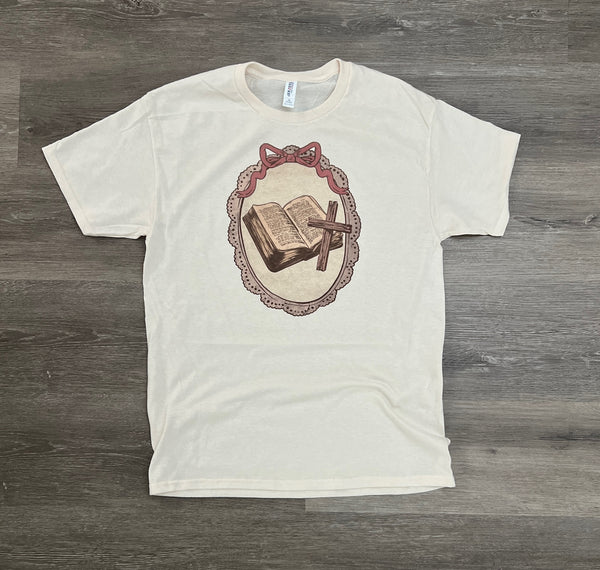 Timeless faith meets vintage charm in our Scripture & Cross Cameo Tee. Featuring a beautifully illustrated open Bible and cross framed in a delicate cameo-style design, this tee offers a meaningful and elegant way to express your faith. The soft, neutral tones make it easy to style for everyday wear while keeping the message front and center.
