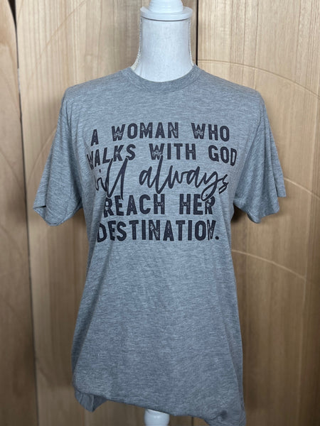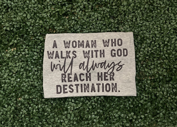 “A Woman Who Walks With God Will Always Reach Her Destination” Tee – Tultex Heather Gray